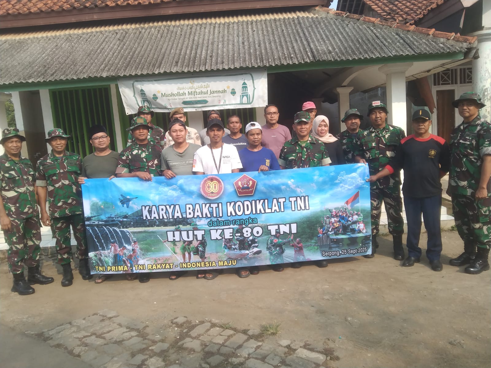 EdithNews.com (Banten) – Kodiklat TNI Memperingati HUT TNI ke-80,Kodiklat TNI bersama warga masyarakat setempat menggelar karya bhakti pembersihan Mushola Nurul Jannah Jln. Lapangan H. Arsan RT.06/07 Ciater Tengah Serpong Tangerang Banten, Jumat (26/09/25).
