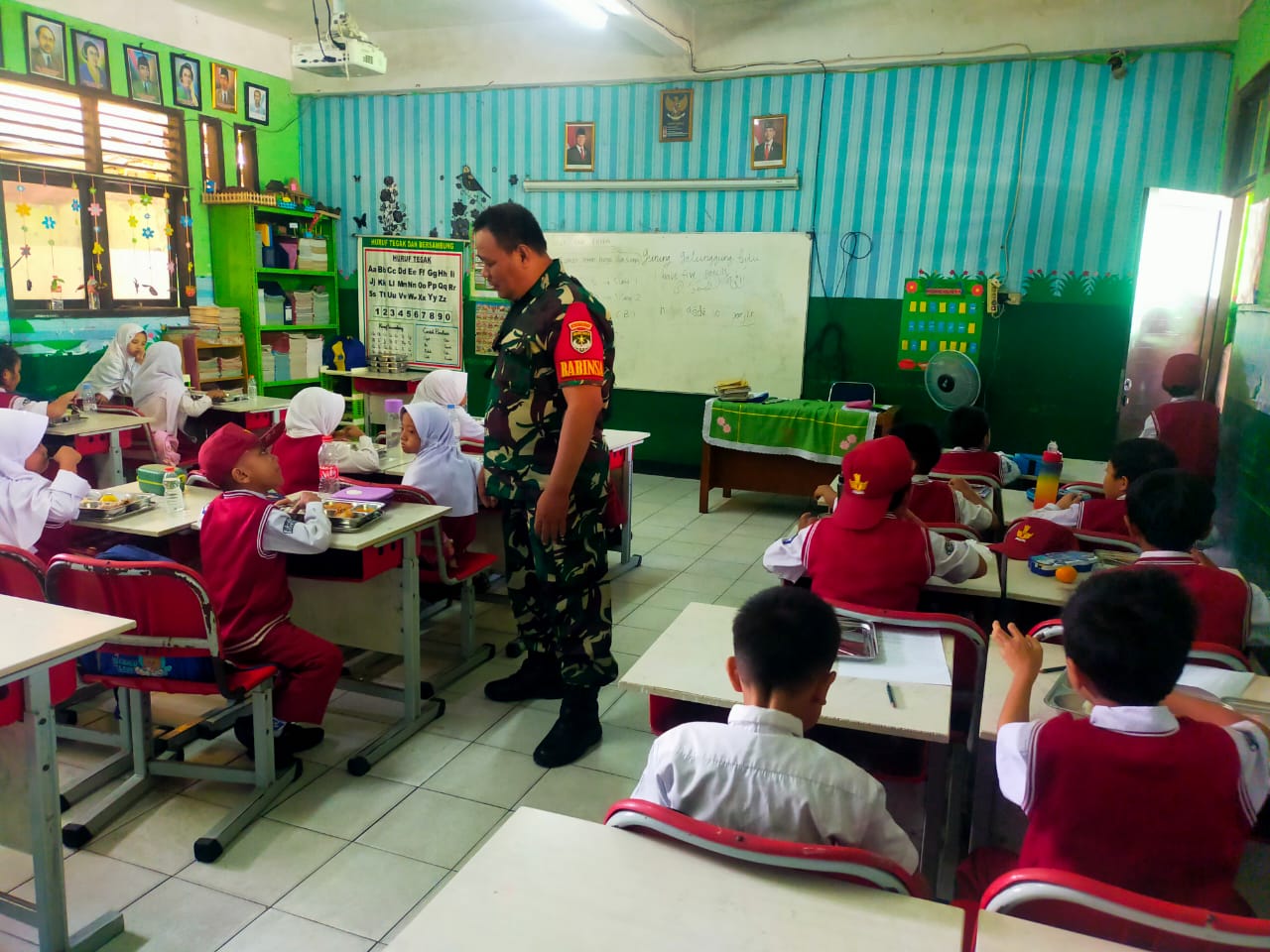 Dalam pelaksanaannya, Babinsa turut hadir secara langsung di lokasi untuk melakukan monitoring sekaligus membantu pendistribusian makanan ke dalam kelas. Kehadiran Sertu Yanto terlihat akrab bersama para siswa, didampingi para guru dan tim dapur sehat.