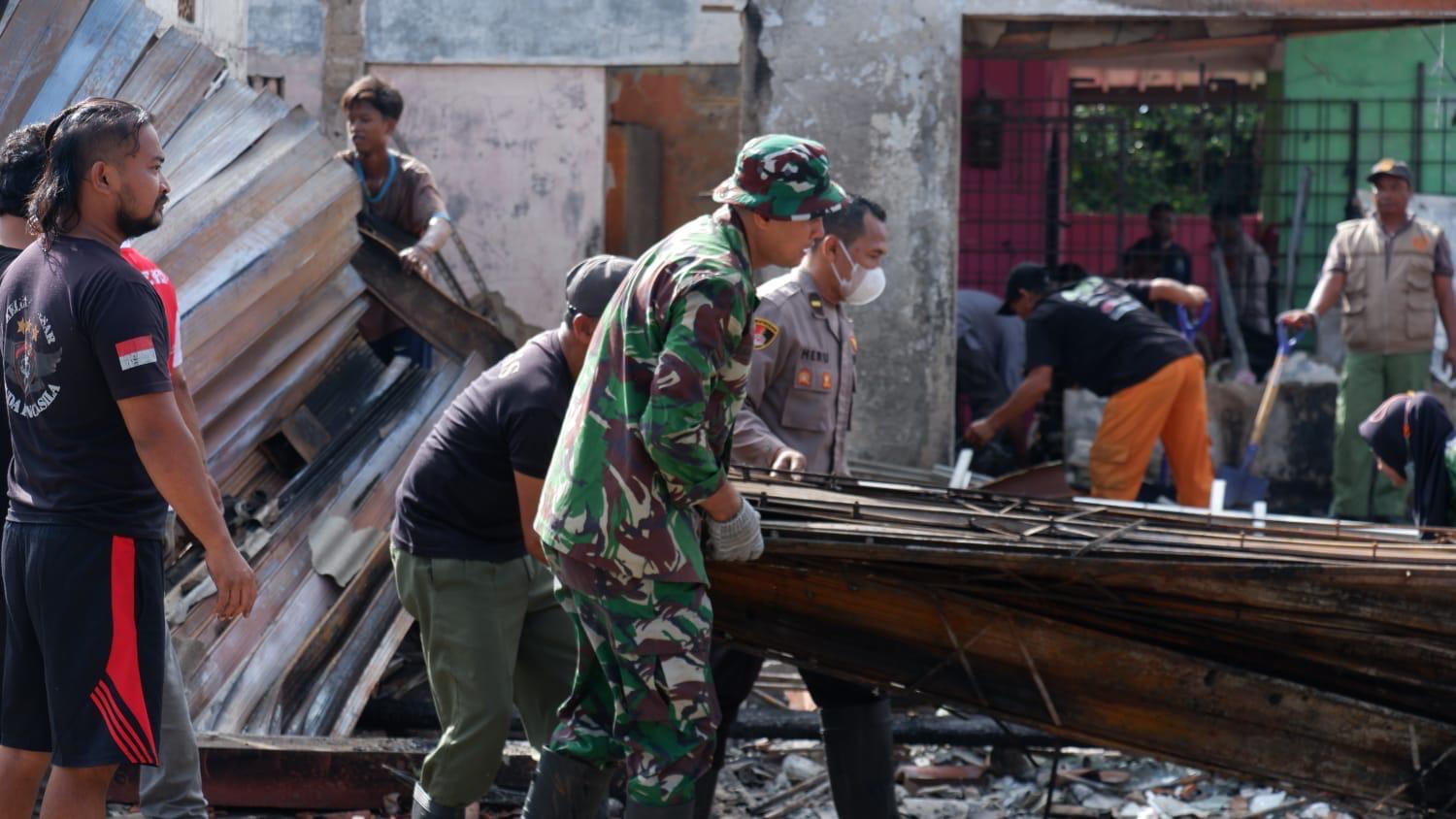 Kegiatan tersebut melibatkan antara lain TNI, Polri, Aparatur Kecamatan Cimuning, Dinas Pemadam Kebakaran Kota Bekasi, Dinas Lingkungan Hidup (DLH) Kota Bekasi, serta unsur pendukung lainnya yang bahu membahu membantu warga membersihkan puing-puing bangunan dan sisa-sisa material yang terdampak kebakaran.
