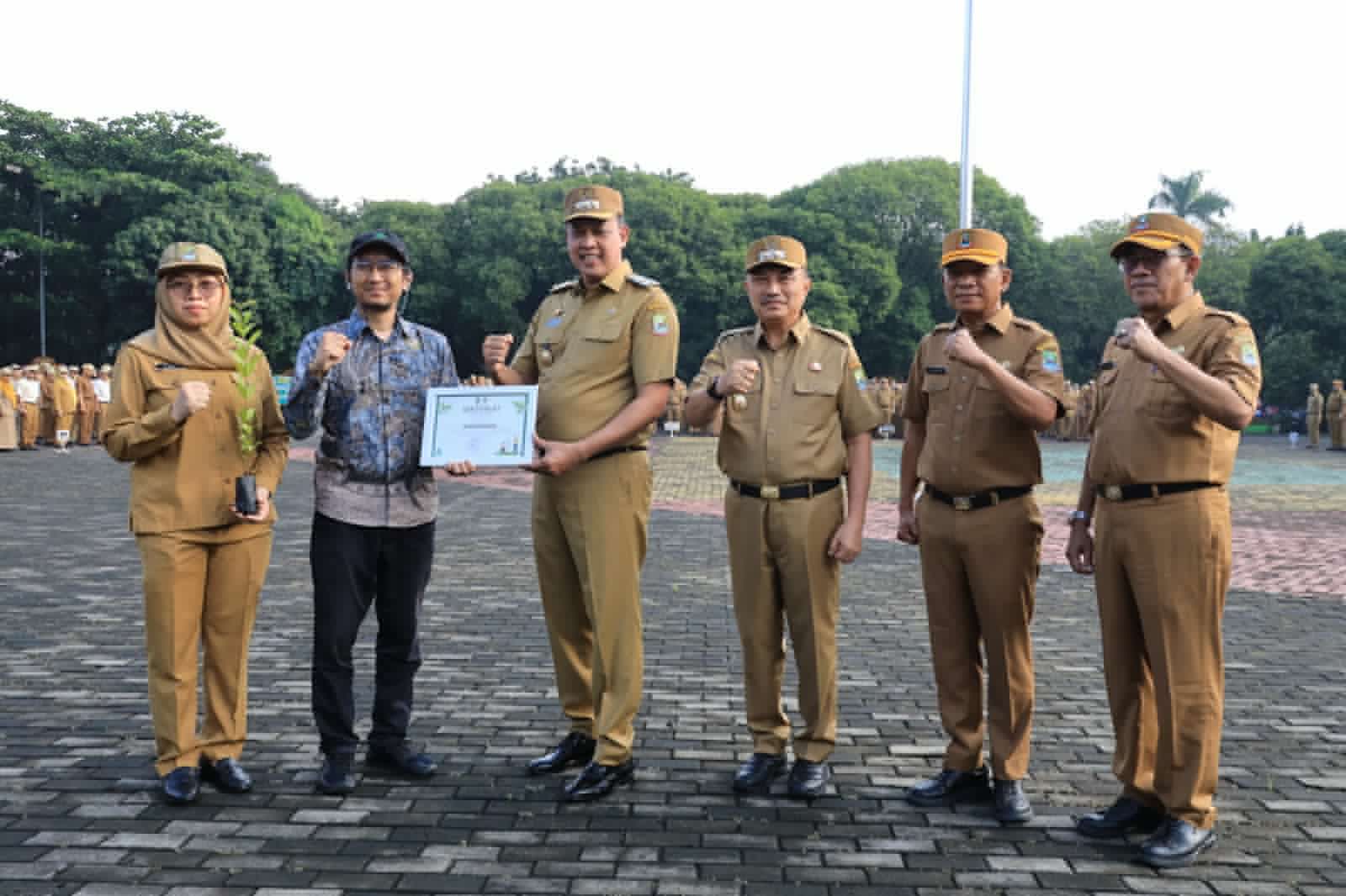 Dikesempatan apel pagi, Walikota dan Wakil Walikota menyerahkan sertifikat apresiasi kepada waste4change dalam upaya mendukung program penghijauan di Kota Bekasi, serta menyerahkan mendali kepada Disdamkarmat yang berhasil mengukir prestasi membanggakan.
