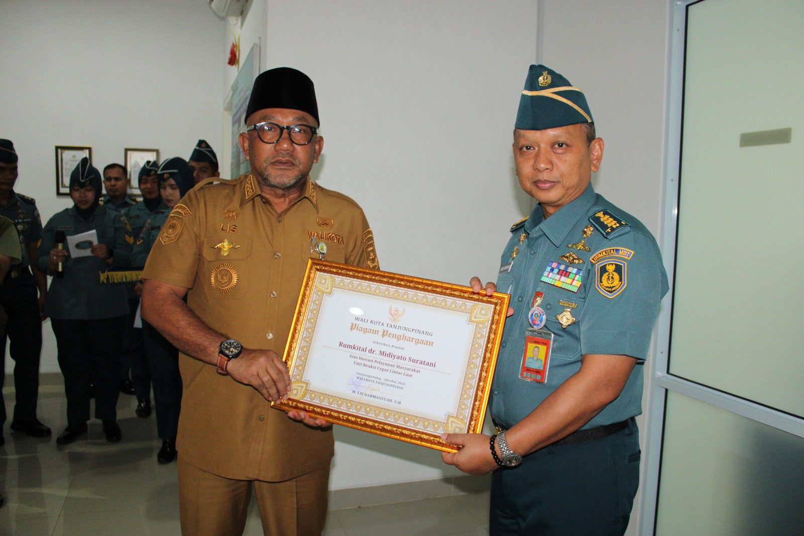 Setelah kegiatan penyelaman kering selesai, dilanjutkan dengan acara resmi Penyematan Brevet Kehormatan Kesehatan Penyelaman dan Hiperbarik oleh Karumkital Dr. Midiyato Suratani. Pada kesempatan tersebut juga dilaksanakan penyerahan piagam penghargaan dari Walikota Tanjungpinang kepada Rumkital Dr. Midiyato Suratani atas Inovasi Pelayanan Masyarakat, Unit Reaksi Cepat Lintas Laut.